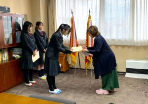 先月10月21日(火)、華道部の高校生3名に本校の華道池坊を指導していただいている田口先生から、校長室にてお免状が授与されました。