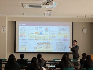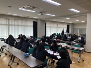 1月28日(水)、高校3年保育進学系の生徒と総合進学系の生徒で、卒業後の自分の人生を考える学習時間になりました。学習テーマを「ライフマネジメントについて考える」と題して、アクサ生命保険株式会社より、谷村龍信さまと湯本新平さまにご講演をいただきました。