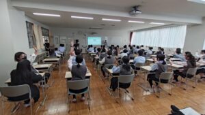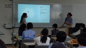国際交流派遣員のオーストラリア‣ナルワーレン出身のクリスティさんにオーストラリアについての講演をして頂きました。クイズ等を交えながらオーストラリアを楽しく学ぶことができました。生徒も英語で質問をし、和やかに交流を深めることができました。3年生はもうすぐオーストラリアに語学研修に行きます。貴重な学びの機会となりました。