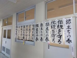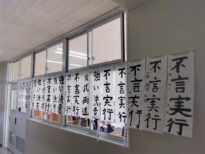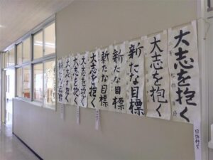 中学校で書初めを廊下に張り出しています。気持ちのこもった力作が並びました。各賞もついた3学年の作品を高校生をはじめ多くの先生、生徒が鑑賞しています。